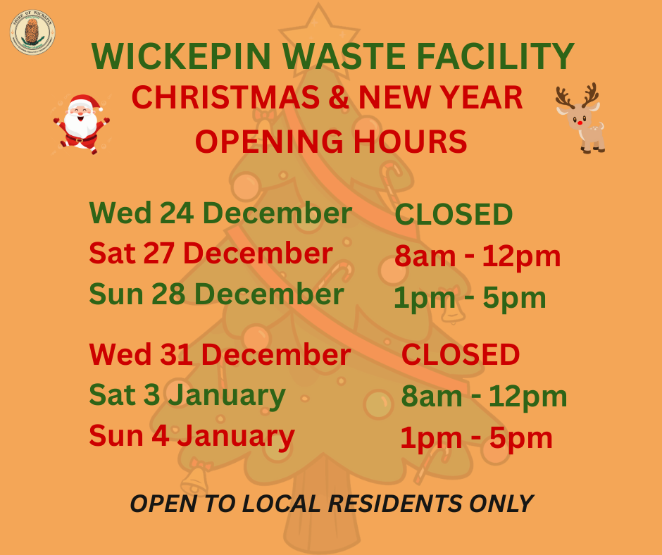 Great Southern Waste Narrogin are responsible for the rubbish collection and recycling within the Shire of Wickepin every Monday. Bins are to be out on the verge on Sunday evening or by 6.00am on the day of collection.